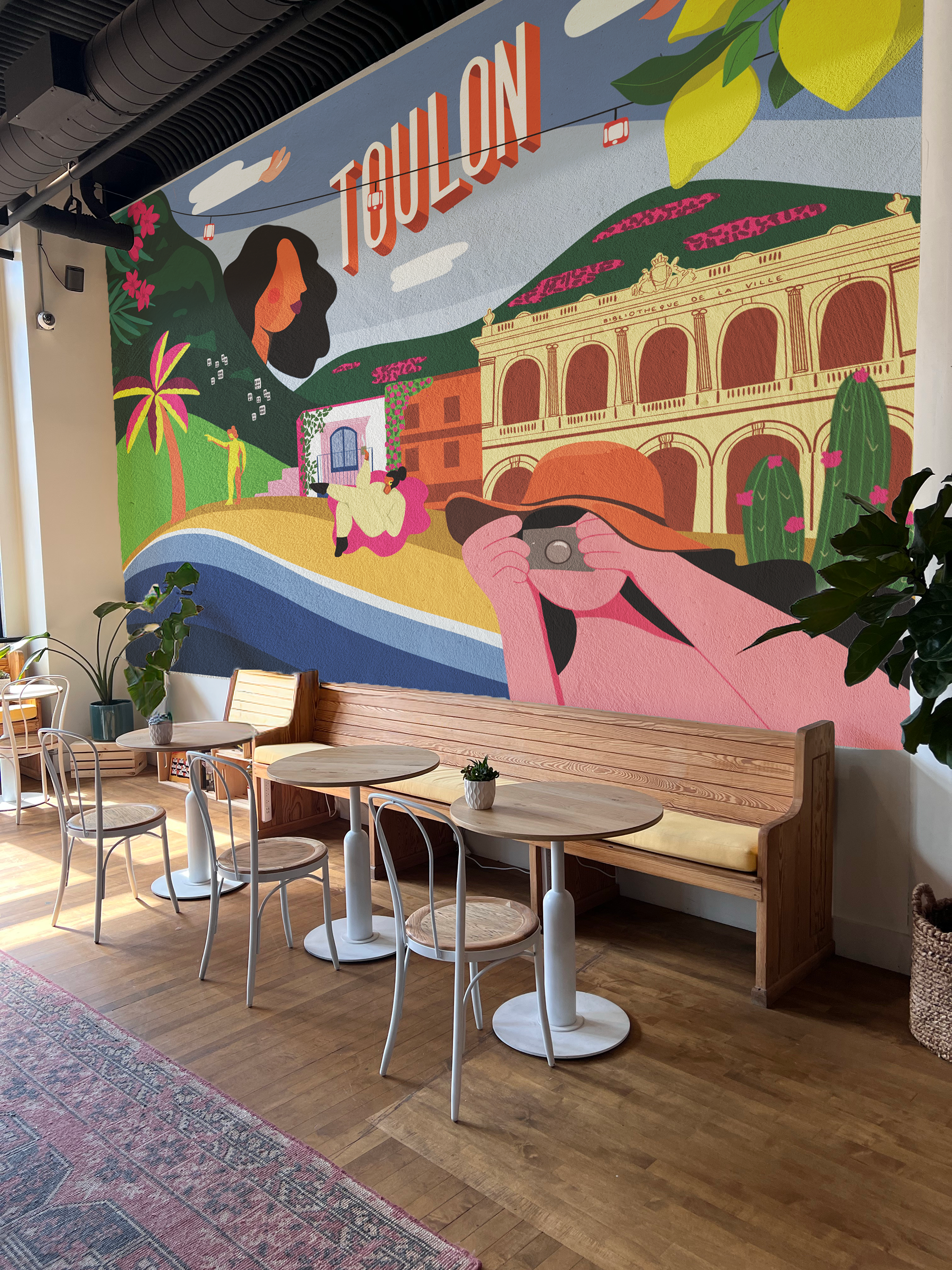 Les fresques racontent des histoires et font voyager, voici un exemple de fresque murale proposé à un coworking de Toulon qui met en avant la vie Toulonnaise avec ses paysages touristiques et ses monuments.